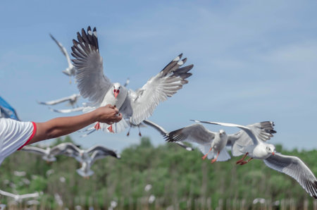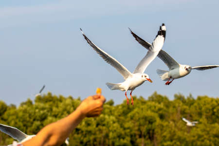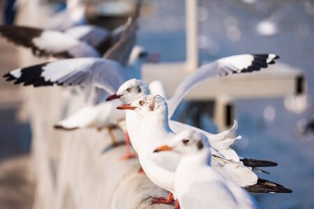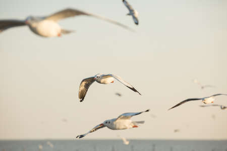 A flock of seagulls on the coast at Samut Prakan Province in Thailand.
