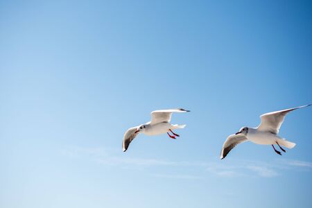 Seagulls are flying above the sea, the sky is blue and cloudless . Single seagull flying with with sea as a background
