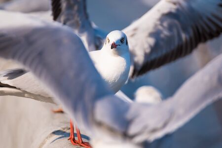 flock of sea gulls flying fighting for food on beach by the sea. Image with selective focus