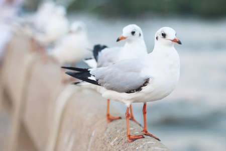 Standing seagulls lined up in a diagonal on a wall, near the sea, BangPoo Gulf of Thailand.