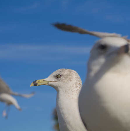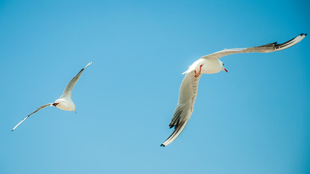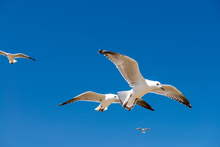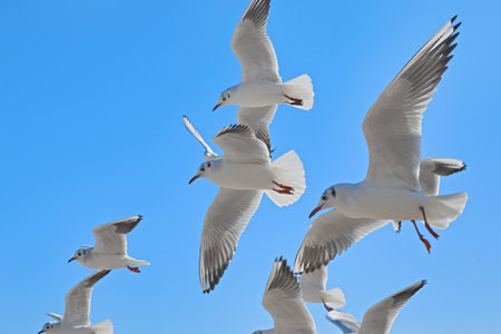 Many seagulls fly in sunny clear blue sky outside. Horizontal color photography.