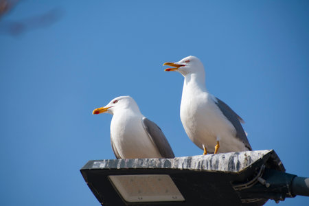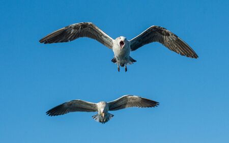 Flying shouting Kelp gulls (Larus dominicanus), also known as the Dominican gull and Black Backed Kelp Gull. Blue sky background. False Bay, South Africa