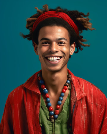 Happy young African man in Hawaiian necklace standing against red background : Generative AI
