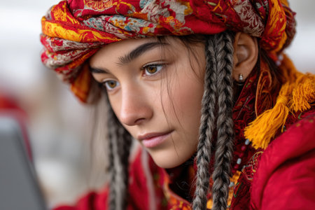 Colorful traditional festival celebrates cultures with young woman generated by artificial intelligence