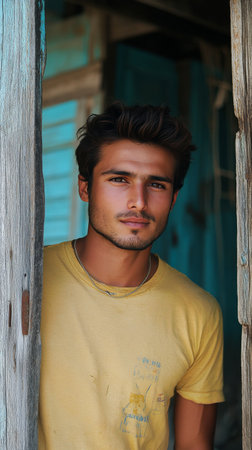 A man poses with a relaxed expression in front of old, peeling wooden doors. His casual outfit and confident stance suggest comfort in this rustic setting, captured during daylight.
