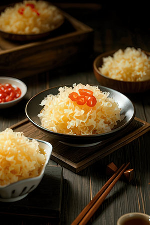 Close uo traditional noodle topping Pickles and pork in breakfast restaurant