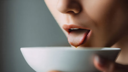 Close-up of a woman tasting food from a white bowl, showcasing culinary exploration and sensory experience.