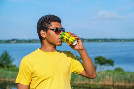 African American man in sunglasses enjoying the taste of coffee outdoor in summer near river.