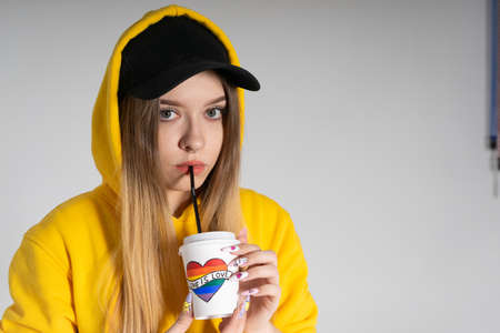a woman in a yellow hoodie and a black cap drinks coffee from a paper cup with the words love is love and a heart with an LGBT rainbow