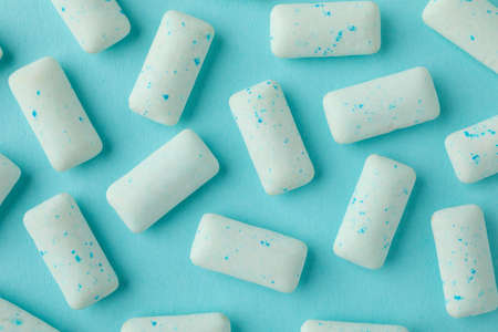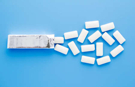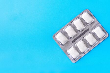 Pads of white chewing gum on blue background. Fresh mint bubble gum.