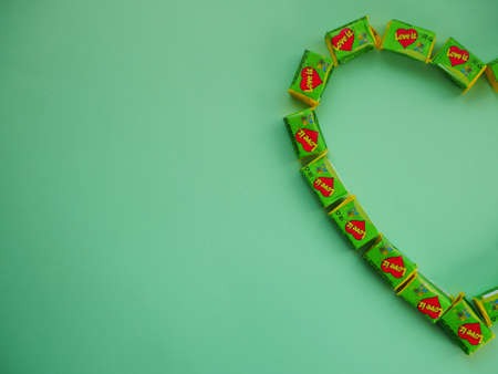 Germany, Berlin - March 3, 2020: Love Is.. Bubble Gum . Various Flavors of Love Is Chewing Gum with Liners About Love in Pile.March 8 gift concept. top view