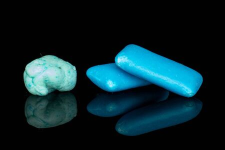 Group of two whole blue chewing gum with one bolus isolated on black glass