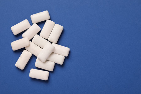 Many chewing gum pieces on blue background, flat lay. Space for text