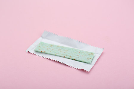 rectangular pieces of gum in a blister pack on a green background, copy space