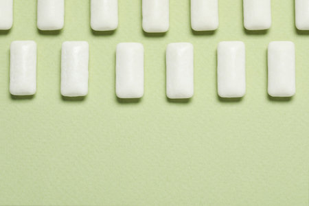 Tasty white chewing gums on light green background, flat lay. Space for text