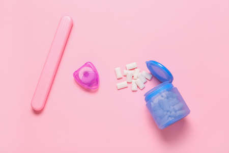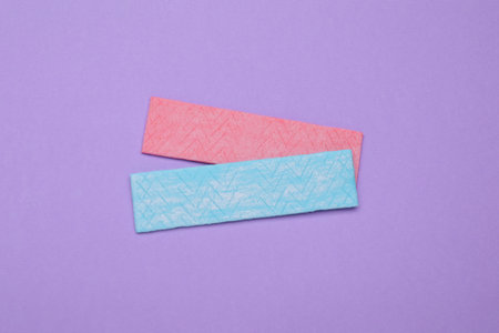 A few chewing gums lie on texture background of fashion pastel yellow color paper in minimal concept.