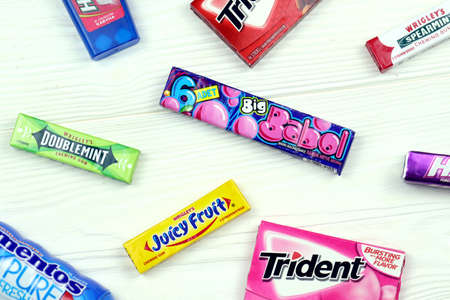 KHARKOV, UKRAINE - JULY 2, 2021: Many chewing gum packs in various flavors and pack design.