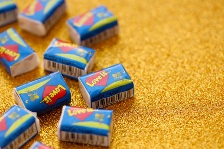 TERNOPIL, UKRAINE - JUNE 23, 2022: Love is - turkish bubble gums from 1990s popular in russian region. Various flavors of Love is chewing gum with liners about love in pile