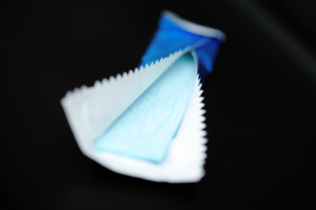 Pack of white chewing gum on blue background. Pads of fresh mint bubble gum.