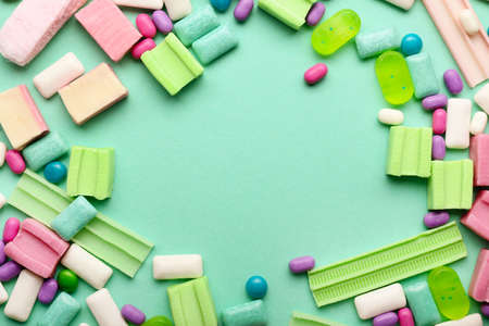 Many chewing gum pieces on turquoise background, flat lay. Space for text