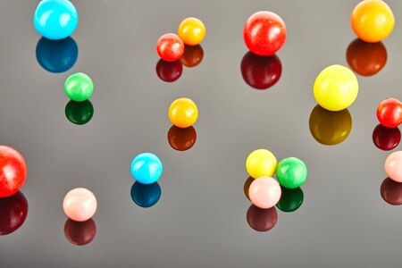 Multi-colored balls of chewing gum on a gray background with reflection.