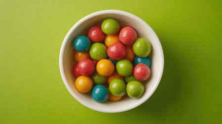 A bowl filled with colorful candy balls sits against a bright green background, creating a playful and vibrant image perfect for food-related projects or festive themes.