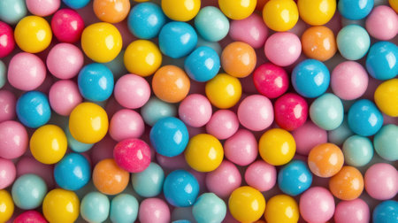 Vibrant colorful round candies scattered across a bright yellow background