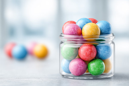 A delightful array of colorful candies spills from a glass jar, creating a cheerful scene filled with vibrant treats. Perfect for capturing the joy of sweets and celebrations.