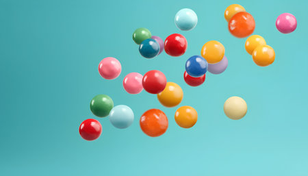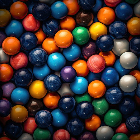 Shiny multicolored spheres in vivid hues, arranged in an abstract pattern, reflecting saturated colors and a playful, marble-like design.