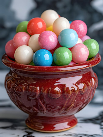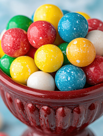 Close-up of colorful gumballs in a red bowl. Sweet and delicious.