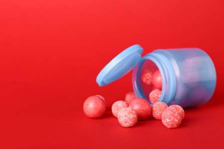 Jar with tasty chewing gums on color background