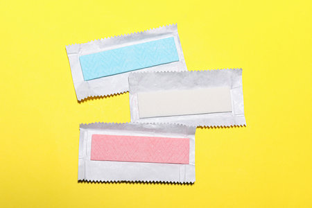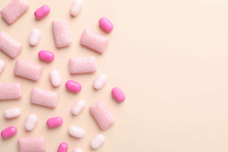 Sweet chewing gums on yellow background, flat lay. Space for text