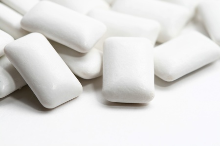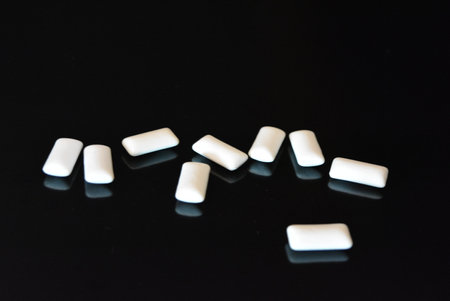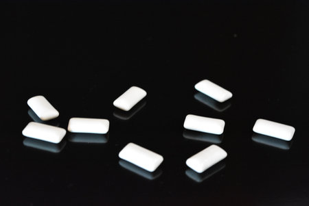 White chewing gums isolated on a black background. White chewing gums. Food, personal care products, product, chewing gum, white chewing pillows, chewing gum arranged on a black.