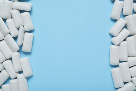 Tasty white chewing gums on light blue background, flat lay. Space for text
