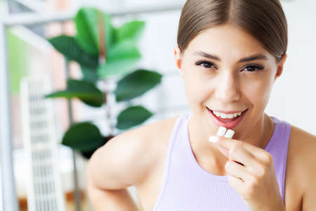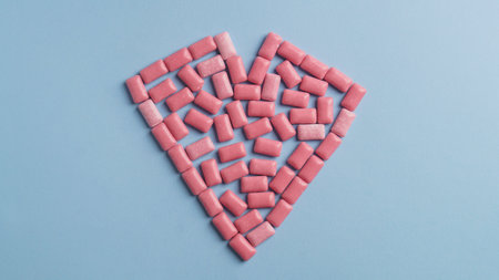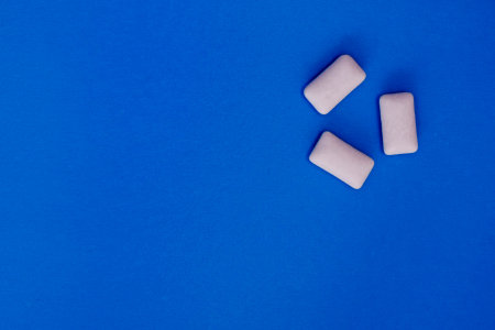 Human jaw model with teeth and chewing gum pads on a blue background. Dental care concept