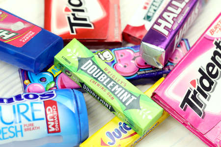 KHARKOV, UKRAINE - JULY 2, 2021: Many chewing gum packs in various flavors and pack design.