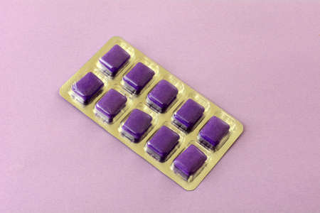 White chewing gums on a pink background. Close-up. On the charcoal, peach paper are white cushions from chewing gum.
