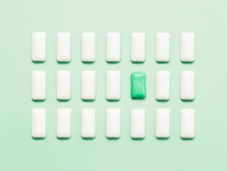 One green chewing gum standing out of white chewing gums. Concept of individuality, uniqueness or loneliness, social outcast.