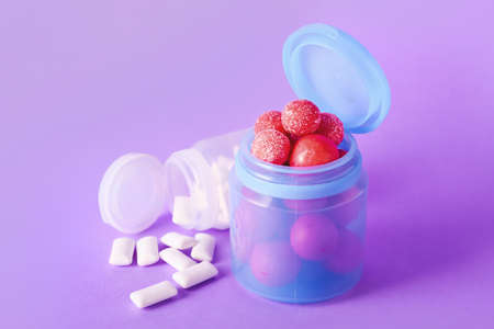Jar with chewing gums on light pink background, flat lay. Space for text