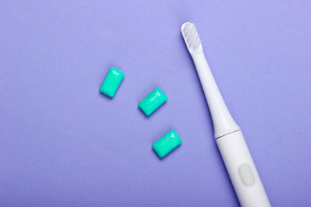 Electric Toothbrush with chewing gum on purple background. Caring for dental health, fresh breath