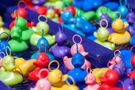 Colorful plastic ducks in the water basin of a traveling carnival stall.