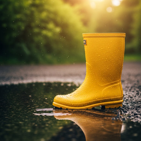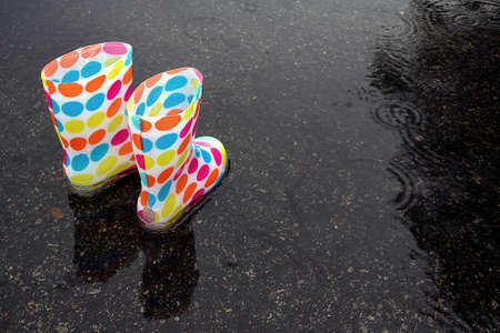 A vibrant pair of polka dot rain boots adds a splash of color to a rainy day scene, standing in a puddle on damp pavement, evoking a playful, carefree mood.