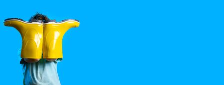 a boy in a light t-shirt covered his face with yellow rubber boots. symbolizes autumn on a blue background