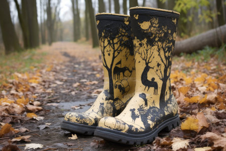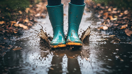Hiker wearing yellow rubber boots jumping in a puddle in a forest creating splashes. Ai generated image
