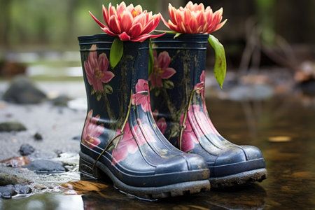 a pair of rain boots in a puddle, with water lilies growing inside them