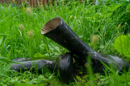 Dirty yellow rubber boots with a white border lie on the wet grass near the tent in a tourist camp.Summer time