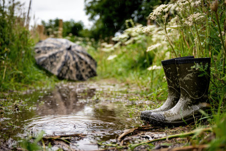 Muddy path with a puddle of rain water, patterned rubber boots resting in the mud, and a patterned umbrella standing nearby. The scene is full of lush greenery and wildflowers.
