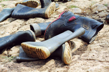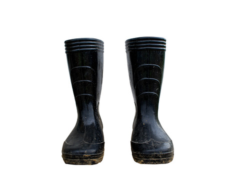Muddy work boots, human leg with dirty rubber boots. Made with shallow dof.