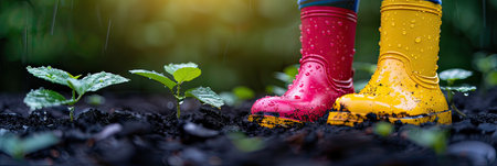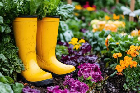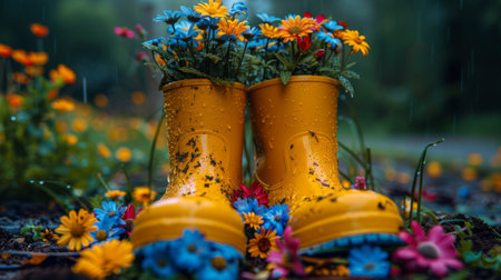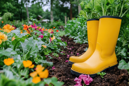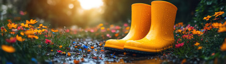 Yellow rain boots in a garden, surrounded by blooming flowers, soft sunlight, vibrant and cheerful