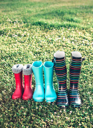 Red and blue and striped rubber boots for adults and children placed on meadow with young green grass in sunny day